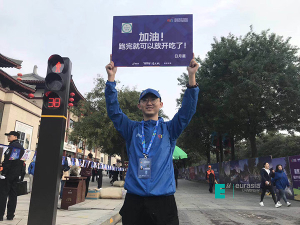 直到下午2:00,最后一位全程马拉松队员停歇,志愿服务才正式结束,从开始到结束服务时长达到8小时。这次志愿活动不仅代表着西安欧亚学院,更代表整个西安的形象。来到场地,每个人都在自己的工作岗站好,手举标语,等待着运动员们的到来,为他们加油,为他们呐喊。