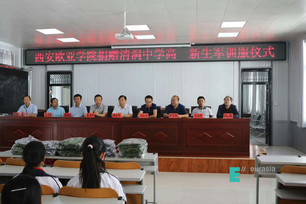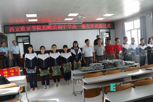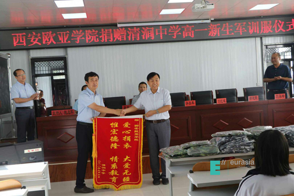 我校与榆林清涧县为“双百工程”结对帮扶单位。去年以来,学校把帮扶的重点放在中小学(幼儿园)校长(院长)培训、新入职员工培训、心理学教师、中小学教研员培训以及清涧县城关小学学生社团建设上。为了扩大帮扶面,今年下半年,我校开始关注清涧县中学生成长,为引导清涧县高一新生树立远大理想、刻苦学习,我校党委书记带着全校2万多名师生员工的关心和厚爱,为清涧县一中高一新生送去了330套军训服。