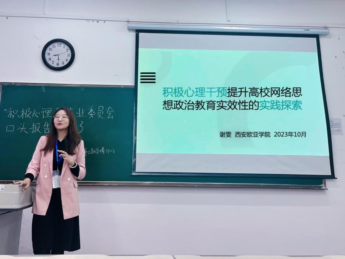 谢雯老师在“积极心理学专业委员会口头报告分场3”中受邀担任主持人,并做了题为《积极心理干预提升高校网络思想政治教育时效性的实践探索》的报告。谢雯老师将西安欧亚学院“以学生为中心”的理念及用积极心理学指导网络思想政治教育的探索与实践,向与会人员进行了分享,并就“积极心理干预的信息干预如何开展”“如何用最少的资源发挥最大的作用”“如何通过积极心理干预挖掘学生内在的积极心理力量”,与参与论坛的专家进行了交流与研讨。