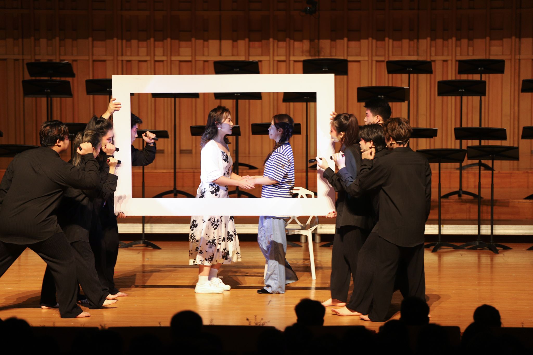 友爱、奉献是收获幸福真谛的秘诀。在大学生艺术团话剧团表演的《无形的重击》音乐剧中,当充满激情和热忱的荣荣陷入自我迷失的境地,家人的陪伴和支持给了她莫大的力量,又让她重新找回了努力前行的方向。11名同学用真挚的感情演绎了这场情节跌宕起伏、温暖又无处不在的剧目。乐观,坚强,将关爱传递给更多的人,幸福的成长,就在眼前。