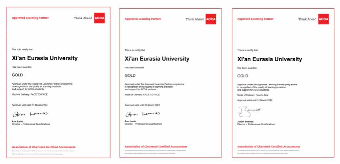2023年,西安欧亚学院连续3年获批“ACCA黄金级教育机构”。ACCA BEIJING OFFICE华北区市场经理刘芳表示,西安欧亚学院能够连续3年获得ACCA黄金级认证,证明了学校、学院各级领导对于ACCA项目的高度重视,以及在ACCA教育方面的出色表现和严格管理。未来,西安欧亚学院将继续夯实国际化商科教育内涵,为成为中国最具影响力的应用型商科大学和培养具有全球视野的高层次商科人才而不懈努力。