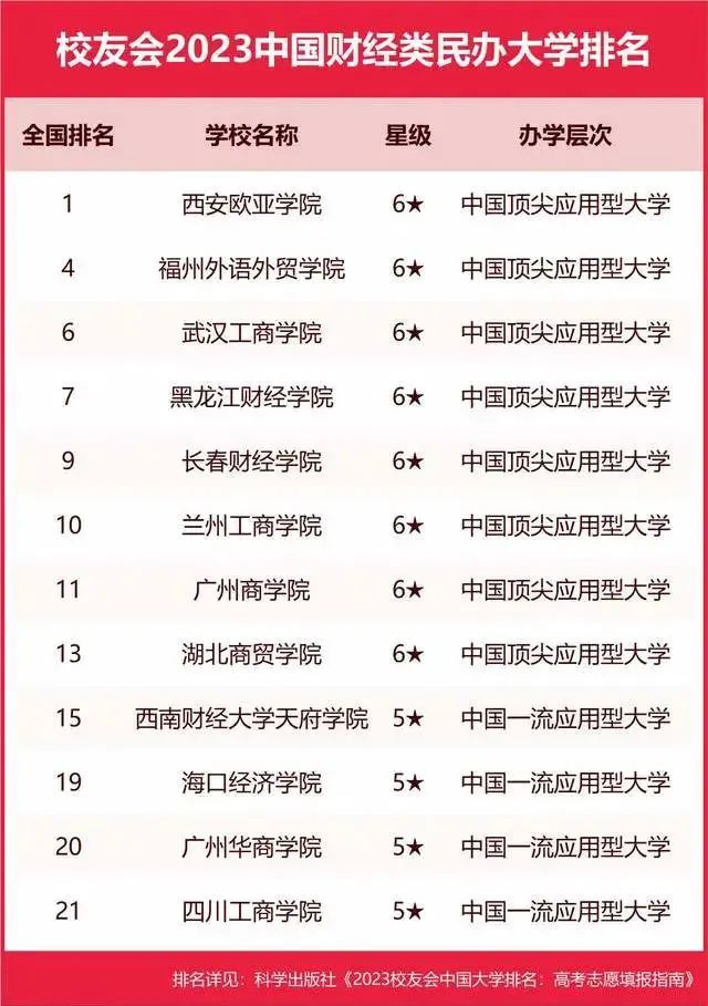 2023年4月6日,全国第三方大学评价机构艾瑞深校友会网正式发布《校友会2023中国大学排名:高考志愿填报指南》。西安欧亚学院凭借高质量办学位列校友会网2023中国民办大学排名Ⅲ类第一名,并连续10年位居校友会“中国财经类民办大学排名”榜首。