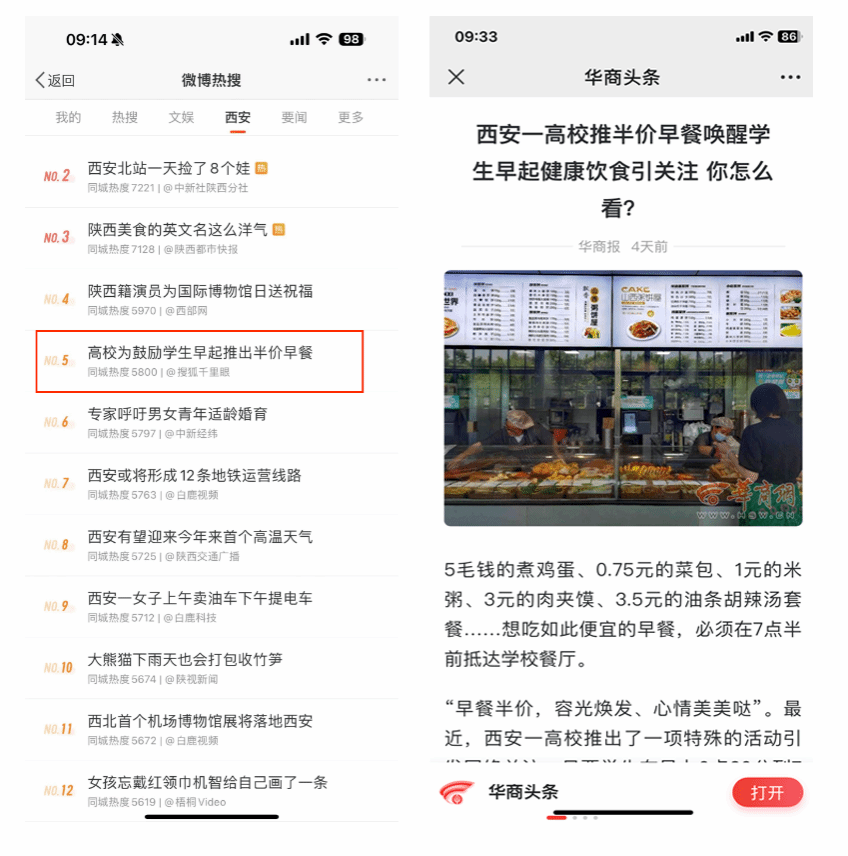 作为第一批“唤醒学生餐”的体验者,大一学生小刘开心地说道:“以前7点半之前基本没去过餐厅,前两天和舍友一起去体验了一次,买了半价的夹馍稀饭,感觉真不错,上课前的时间也宽松了不少,还能省下不少钱,早起真的是一举多得!”