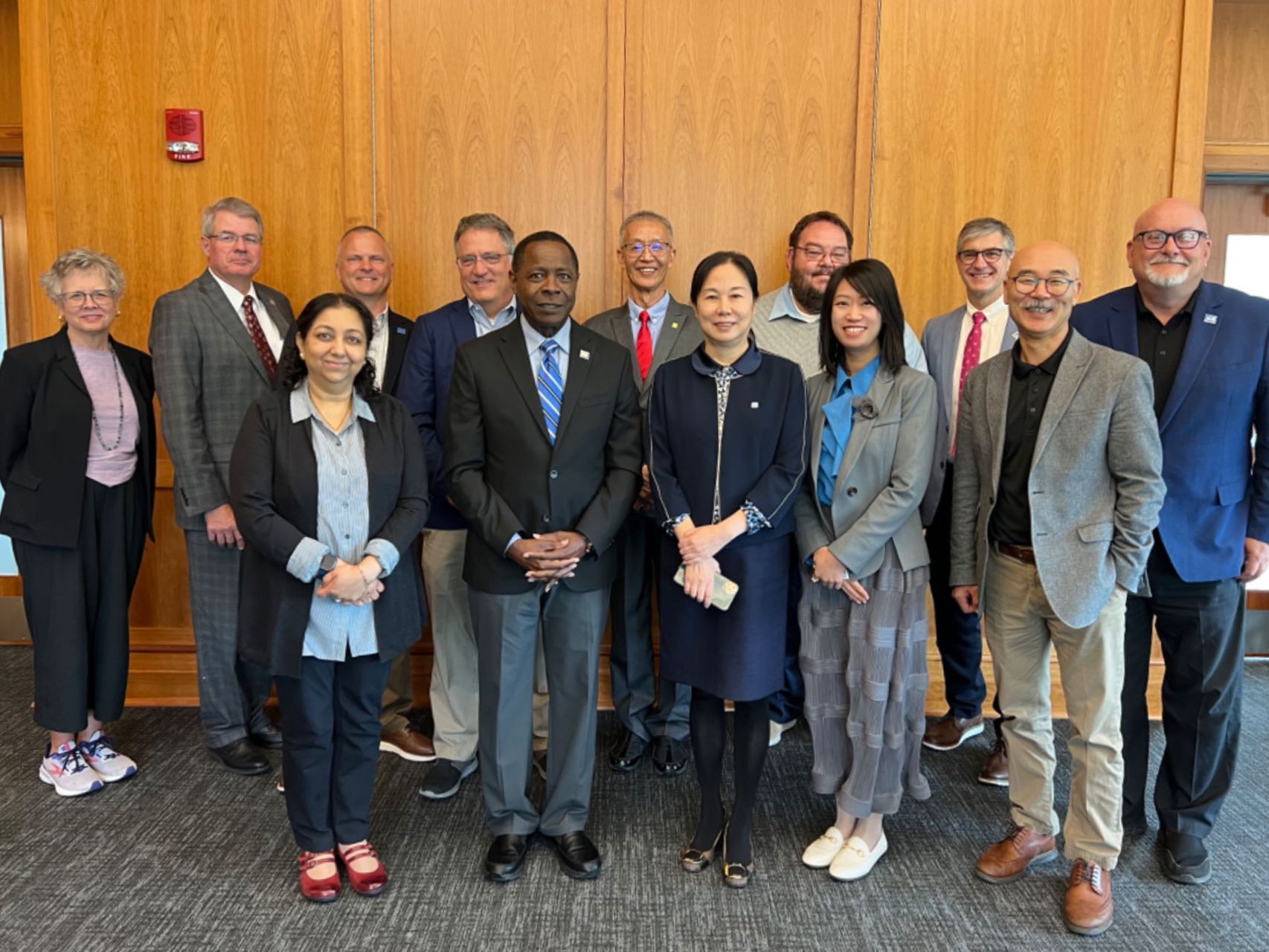(图十二)校长刘瑾(一排右三)、副校长孙建荣(二排右四)与教师丁洁(一排右二)等一行人前往美国中田纳西州立大学洽谈合作办学事宜。