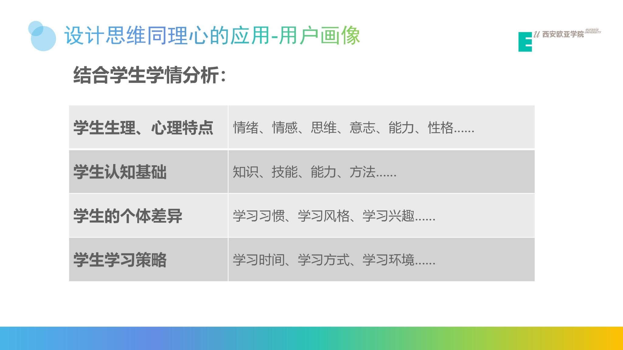 教学中的创新离不开全面与缜密的思考。在《创新思维与设计思维》主题工作坊中,刘迟晓霏老师从创新的特质与类型出发,揭示出创新不仅需要全面而深入地思考,更依赖于科学的创新技能和工具。批判性思维中的理性与反思性是创新过程中不可或缺的思维模式,教师们在创新的每个阶段都需要持续思考与探索。设计思维五个创新步骤中的核心步骤——同理心,能够为教师创新教学提供新的思路。在借助同理心构建学生“用户画像”时,教师应深刻理解学生的需求和特点,进行细致的学生学情分析,这样才能设计出兼具针对性和实用的教学策略。这种以学生为中心的创新方法,不仅提升了教学效果,也丰富了教育的内涵。