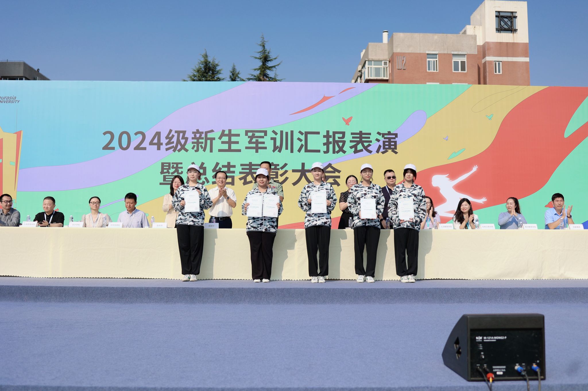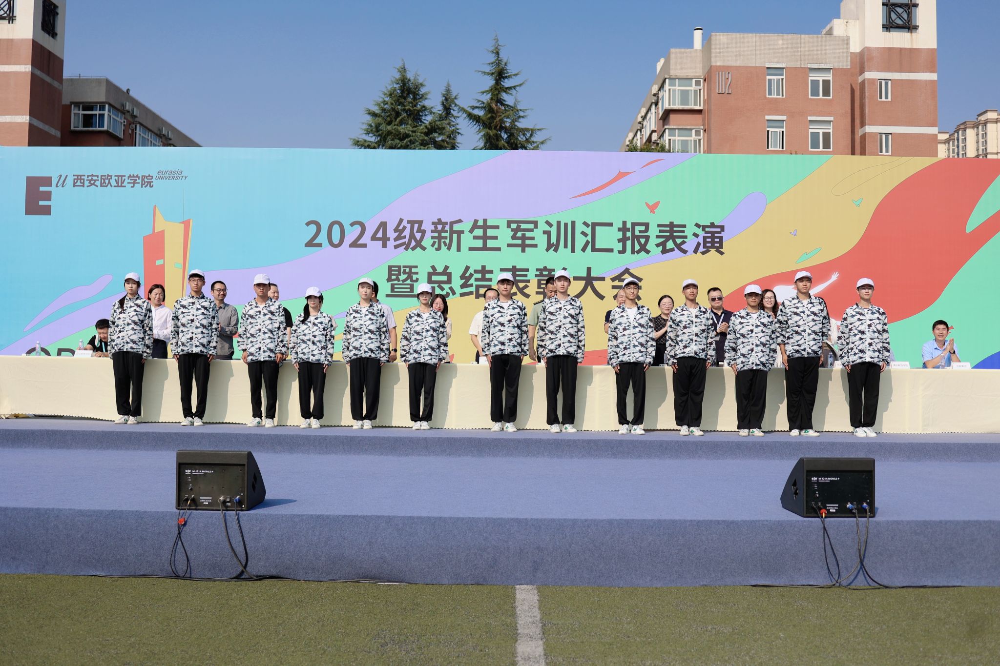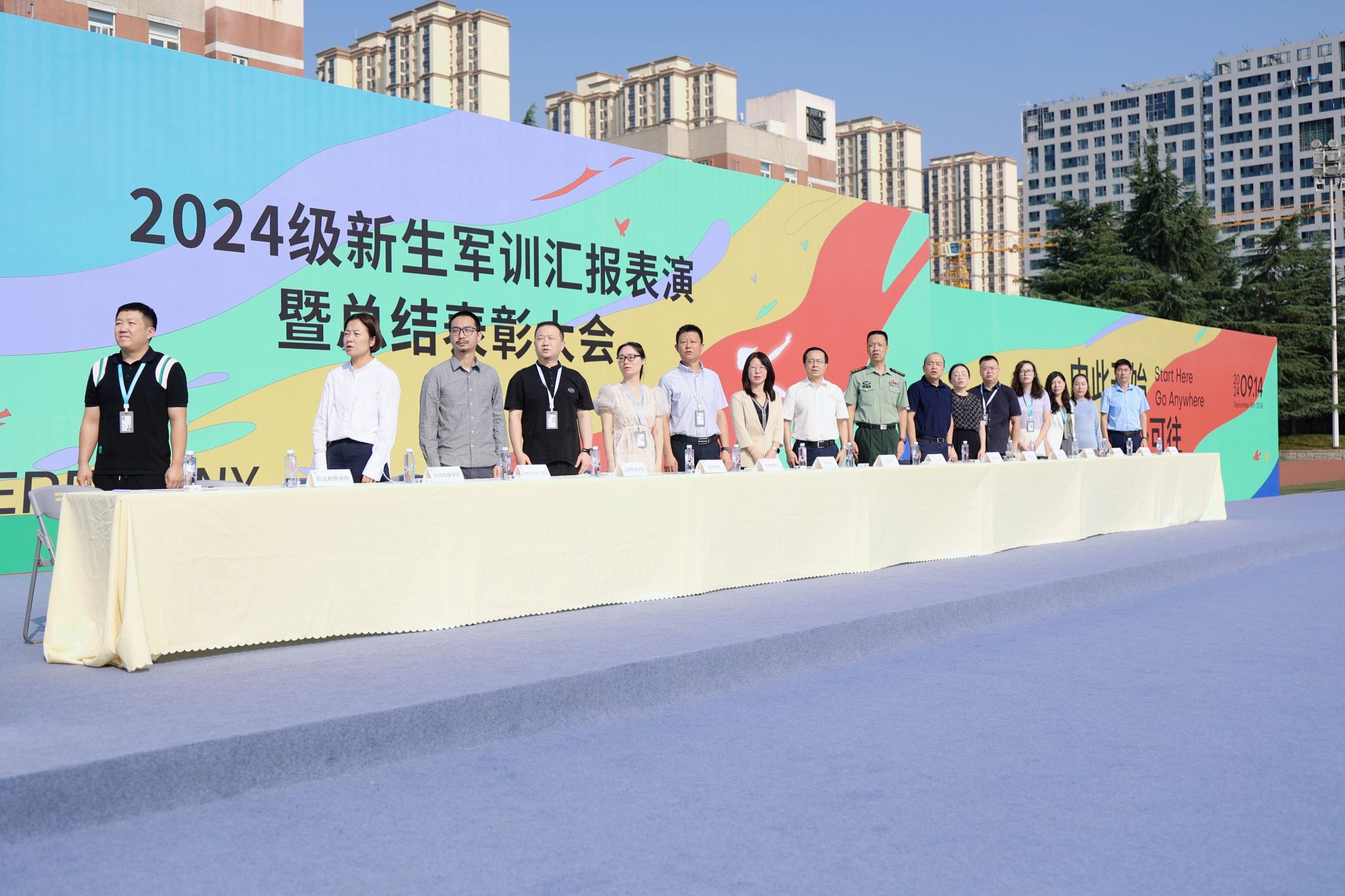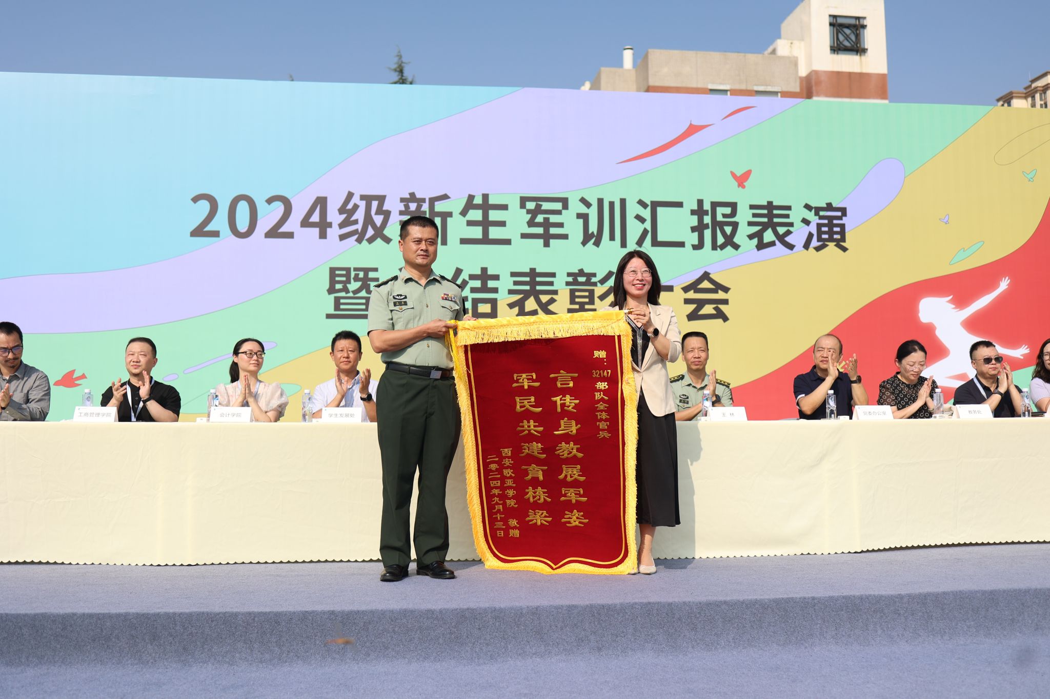 9月13日9:00,西安欧亚学院2024级新生军训汇报表演暨总结表彰大会在学校体育场隆重举行。学校党委书记赵国华同志、学校副校长张乐芳教授,32147部队王林副旅长、王首营长,学校党委办公室、各二级学院、各社区分党委、教务处、学生发展处、后勤集团领导,以及军训旅的40名教官、教导员、指导员出席仪式。此次大会由军训旅副政委、学生发展处副处长张成主持。
