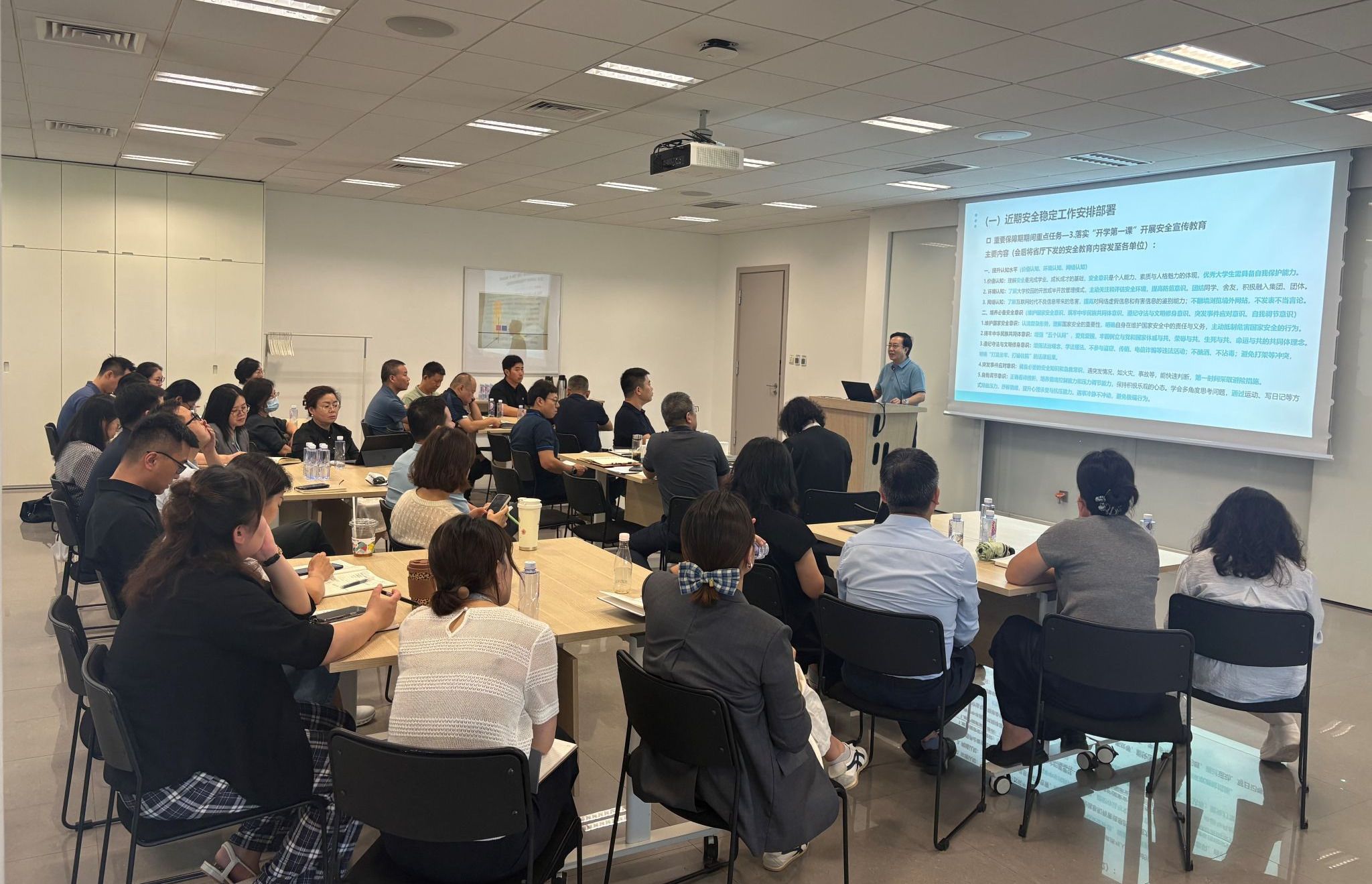 会议首先集中学习了省委教育工委、省教育厅下发的重要保障期安全稳定工作通知精神,并重点传达了8月29日全省教育系统安全稳定工作视频会议精神。其次会议就学校重要保障期期间安全稳定工作向与会单位进行了安排部署。最后,校党委书记赵国华以“安全第一课”的形式,面向全校各职能处室、各二级分院负责人作国家安全与校园安全专题培训辅导。
