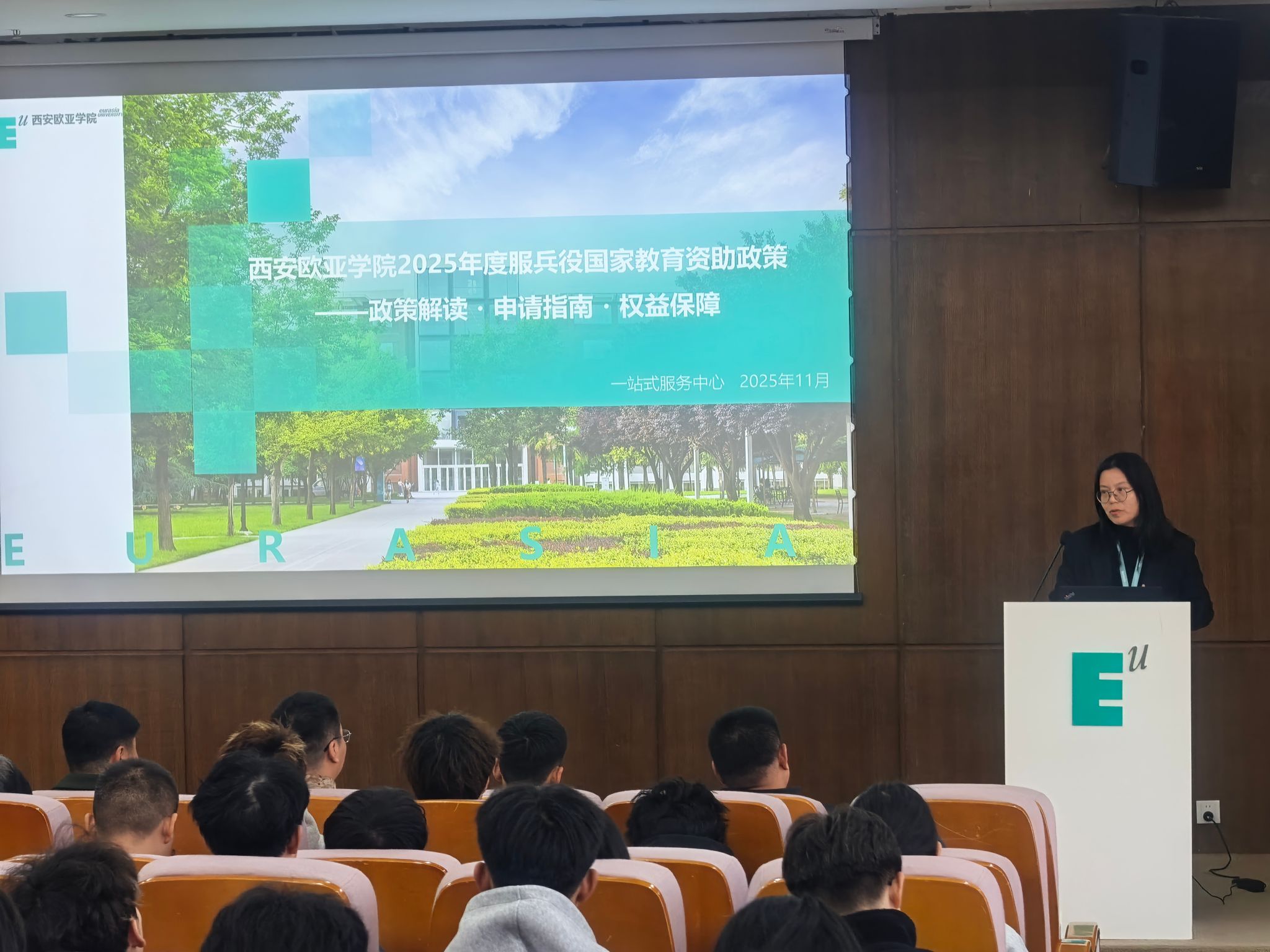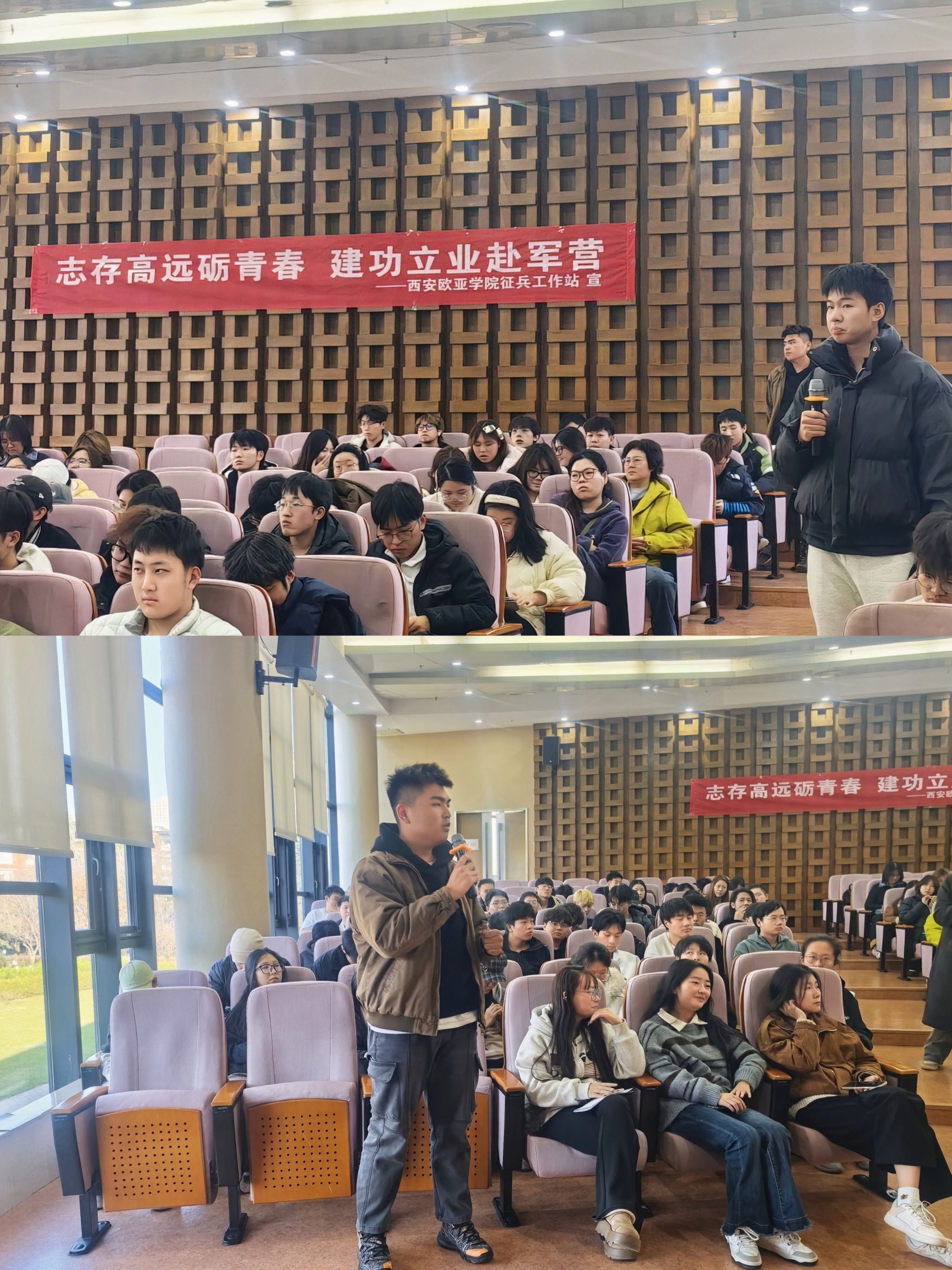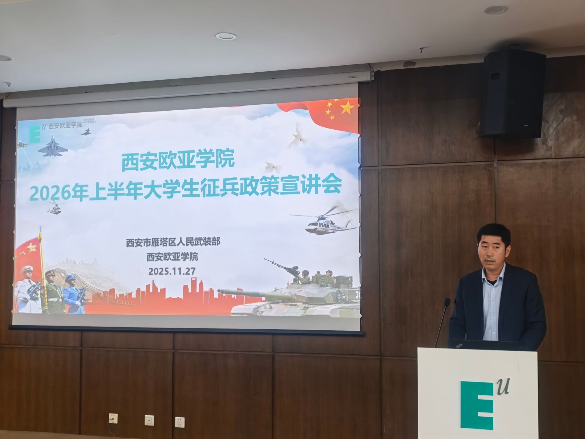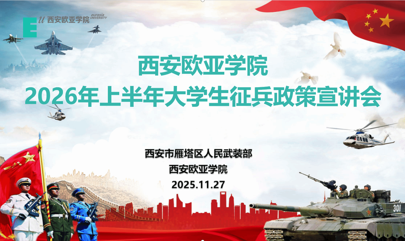 国无防不立,民无兵不安。为深入贯彻落实习近平总书记强军思想,积极响应党中央、中央军委关于征集高素质青年入伍的战略部署,引导广大青年学子将爱国之心化为报国之行,11月27日,以“志存高远砺青春,建功立业赴军营”为主题的西安欧亚学院2026年上半年大学生征兵政策宣讲会在我校图书馆学术报告厅隆重举行。此次活动不仅是一场精准的政策解读会,更是一堂深刻的思想动员课和国防教育课,正式掀开了我校新一年度征兵工作的序幕。