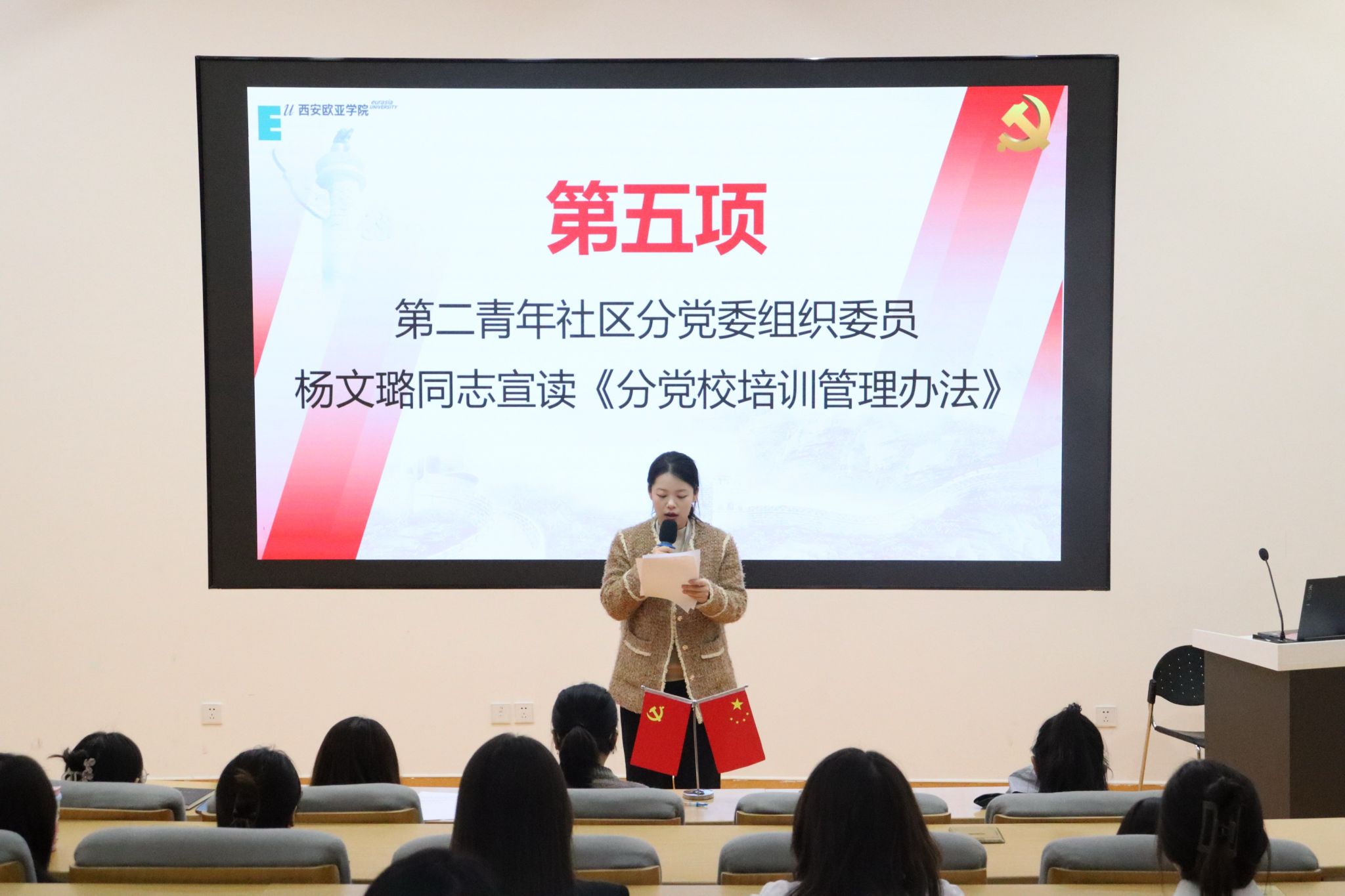 大会第五项,组织委员杨文璐同志宣读《分党校培训管理办法》,要求学员遵守党校各项规章制度,关心集体并积极参与集体活动,将理论与实践相结合,保证更好的学习效果。在学习过程中严格要求自己,积极参加各项培训,认真完成各项任务。