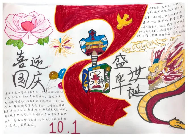 为深入贯彻习近平总书记关于青年工作的重要思想,大力弘扬爱国主义精神,激励青年学子以青春热血抒发爱国之情,用实际行动为盛世中华献礼,为祖国建设添砖加瓦,第二青年社区分党委紧紧抓住国庆佳节这一重要契机,精心策划并组织了庆国庆手抄报活动,引领广大师生以笔墨传情,共抒爱国情怀。