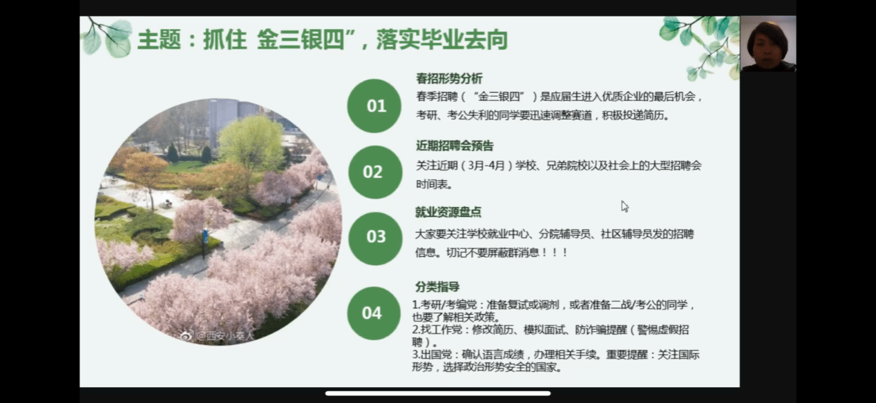 班会最后,老师们鼓励全体同学珍惜校园时光,把握当下机遇,低年级同学要夯实学业基础,做好生涯规划,在全面发展中沉淀成长;毕业班同学要抢抓春招机遇,稳步推进毕业各项任务,顺利开启人生新阶段。