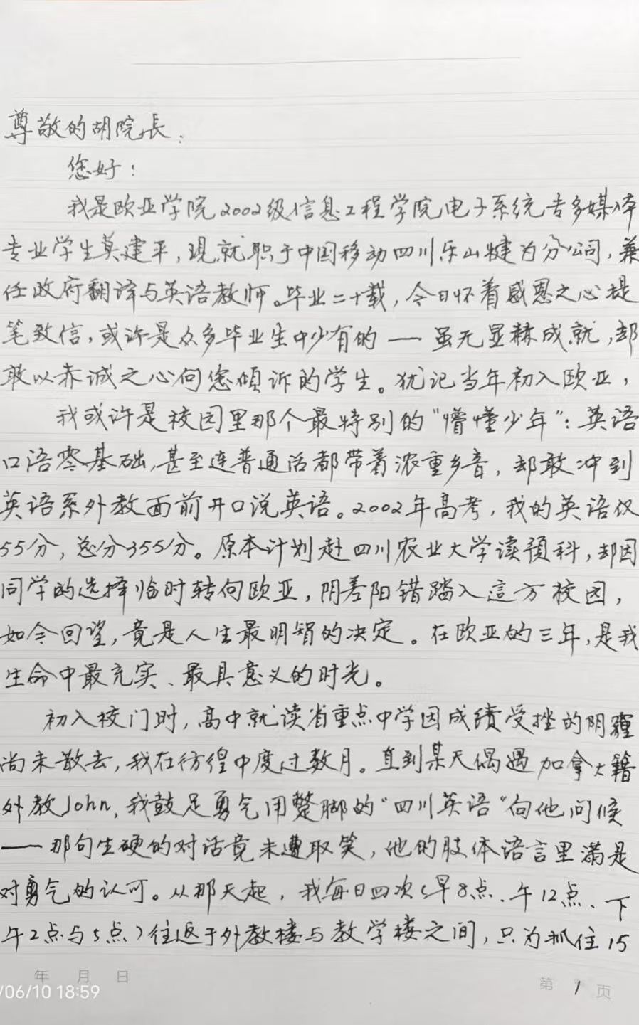 毕业后,我从西安到杭州,再到成都、乐山,先后做过英语培训、翻译,也涉足过国际贸易与外企管理,如今仍在教学与翻译领域深耕——每一份职业选择,都与英语紧密相连。直到今天,我依然保持着每天50分钟早读英语的习惯,因为我始终相信:只有时刻准备好,才能在机会来临时牢牢抓住。感恩母校,让我拥有了更广阔的人生舞台。