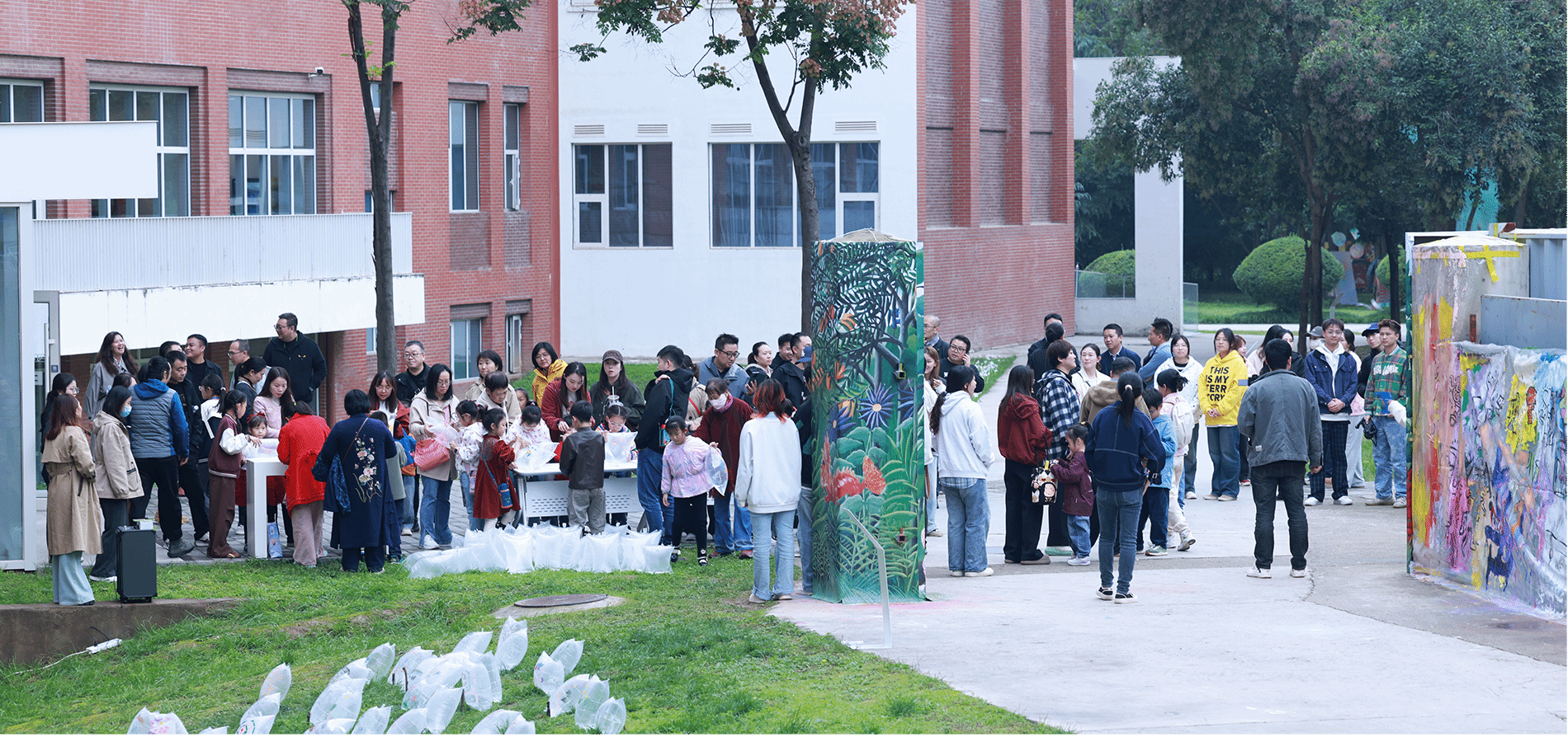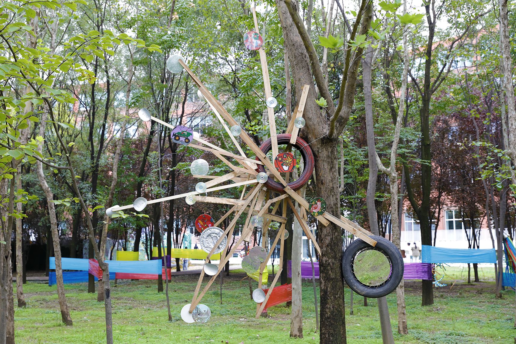 这一次,教学楼周围的草坪、树林、围墙,都成为师生和孩子们创作的画布,大家或手绘涂鸦墙,或用棉绳、轮胎、木条编织有趣的装置,或利用青石板、苔藓、陶泥将作品融入自然之中……1018日,西安欧亚学院儿童大地艺术节在北E教学楼北侧正式启幕,筹备许久的艾多思儿童美术馆也面向公众正式开放。