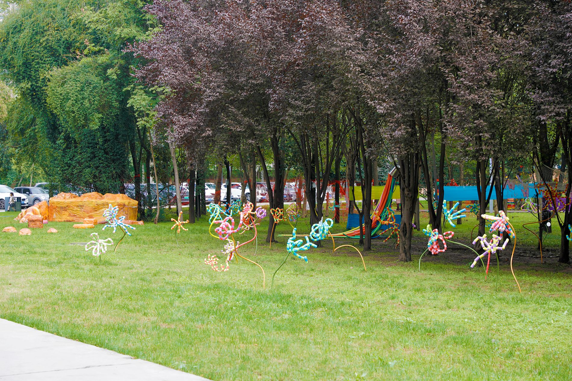 同时,人文教育学院师生极具分量的专业创作,也吸引了观众们的驻足和交流互动。儿童视觉艺术实验班的同学们以300组石膏雕塑,展开关于成长的哲学凝视。教育学专业(儿童视觉艺术教育方向)的学生则分别运用3吨青石板构筑起螺旋石阵,在厚重与流动间诠释人与自然的关系;用3000支光感花束演绎时光色彩,隐喻生命的个性绽放;用30000根工业扎带编织爬树巨人飞翔小狗,将标准化工业材料转化为有机生命形态,探讨工业文明与自然的共生关系。儿童视觉艺术实验班、LE8 ART联合共创的童趣生态的想象构筑,直面树林与工地交界的特殊场域,探索人造基础设施向自然生命的温柔回归。