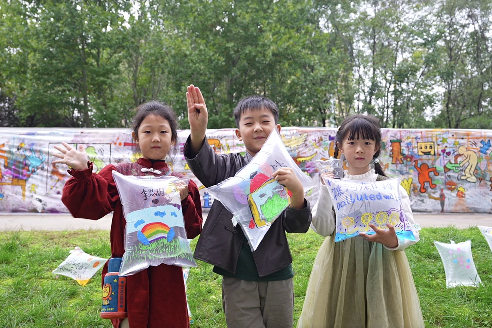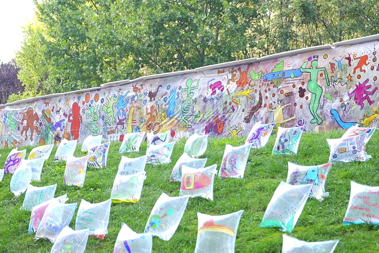 其中,校外参展单位的作品呈现了对儿童艺术教育的深刻理解和多元探索。大家集体共创的涂鸦长廊,以自由挥洒的集体创作,开启了一场关于色彩与想象的狂欢。不知艺术学院带来的光之穹顶”“Hi”“穿林之所”3件作品,分别以轻盈材质构筑冥想空间,以生动手势连接人与自然,以廊道引导沉浸体验,启发观者多维度探索艺术与场域的关系。唐门艺术12名孩子创作的破茧之屋作品,在草坪上搭建起一座60多平米的兼具美感与温度的破茧蜕变之所,让孩童对自然的奇思妙想有了具象载体。LE8 ART和斑斓绘本美术共同呈现的甜蜜的草坪作品充分激发味蕾,孩子们亲手绘制的金黄面包错落点缀于草坪,创造出独特的通感体验。彩色树儿童美育工作室创作的呼吸 水源 循环作品,让孩子们能够更加直观地理解生态循环的奥秘。