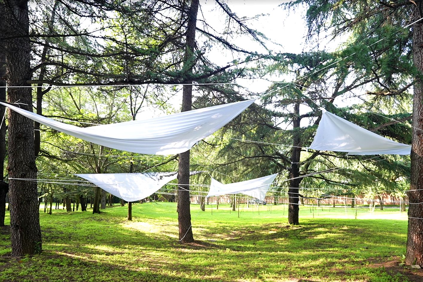 以白布与尼龙绳在林木间构筑出一座漂浮的半透明穹顶,通过材质的轻盈特性与自然元素形成深度对话,创造出可供冥想、舞动的开放场域。