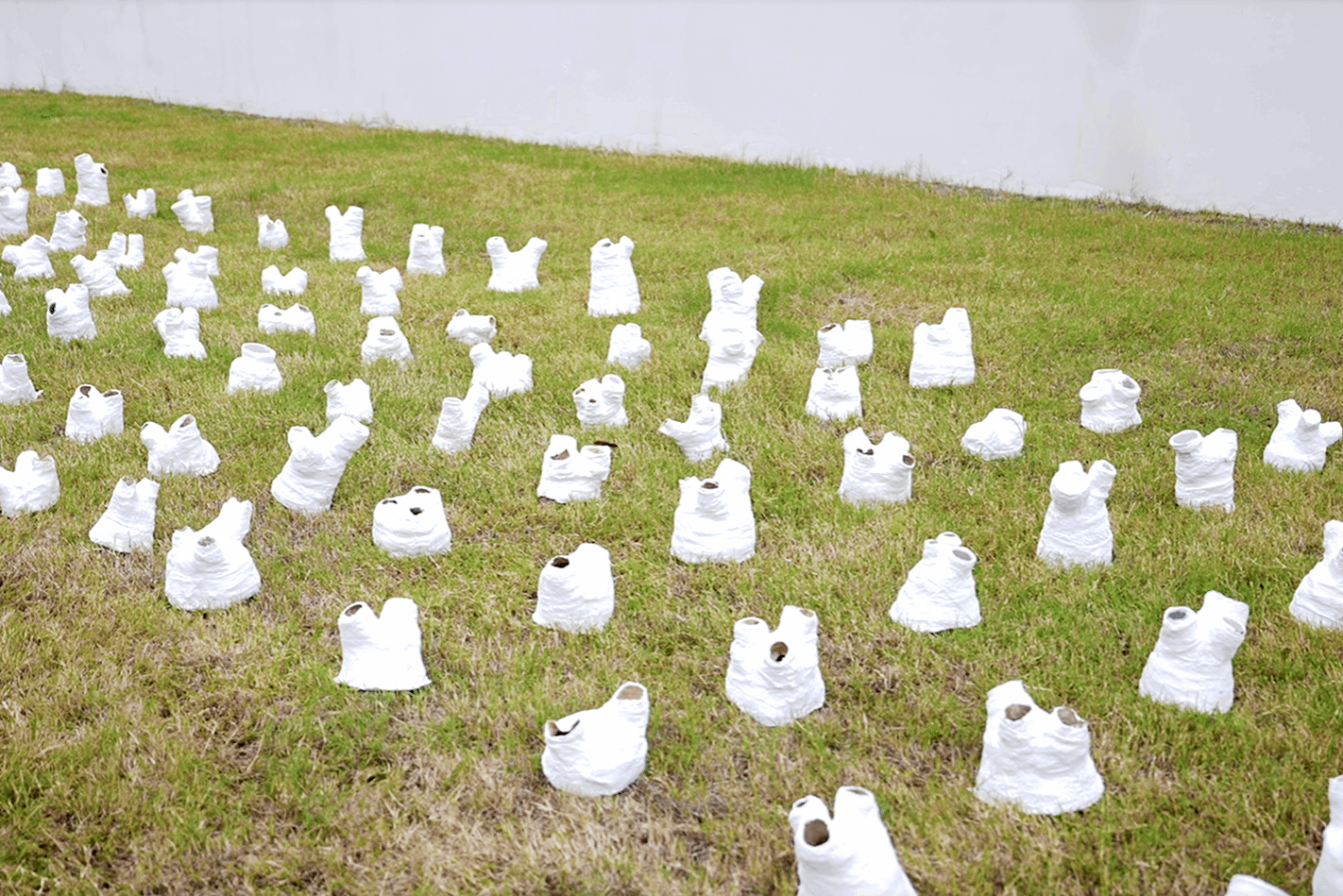 以石膏绷带与镜片为媒介,通过绷带的缠绕与凝固,具象化地呈现了外界规范对生命形态的塑造过程,引导观众思考成长的真谛。