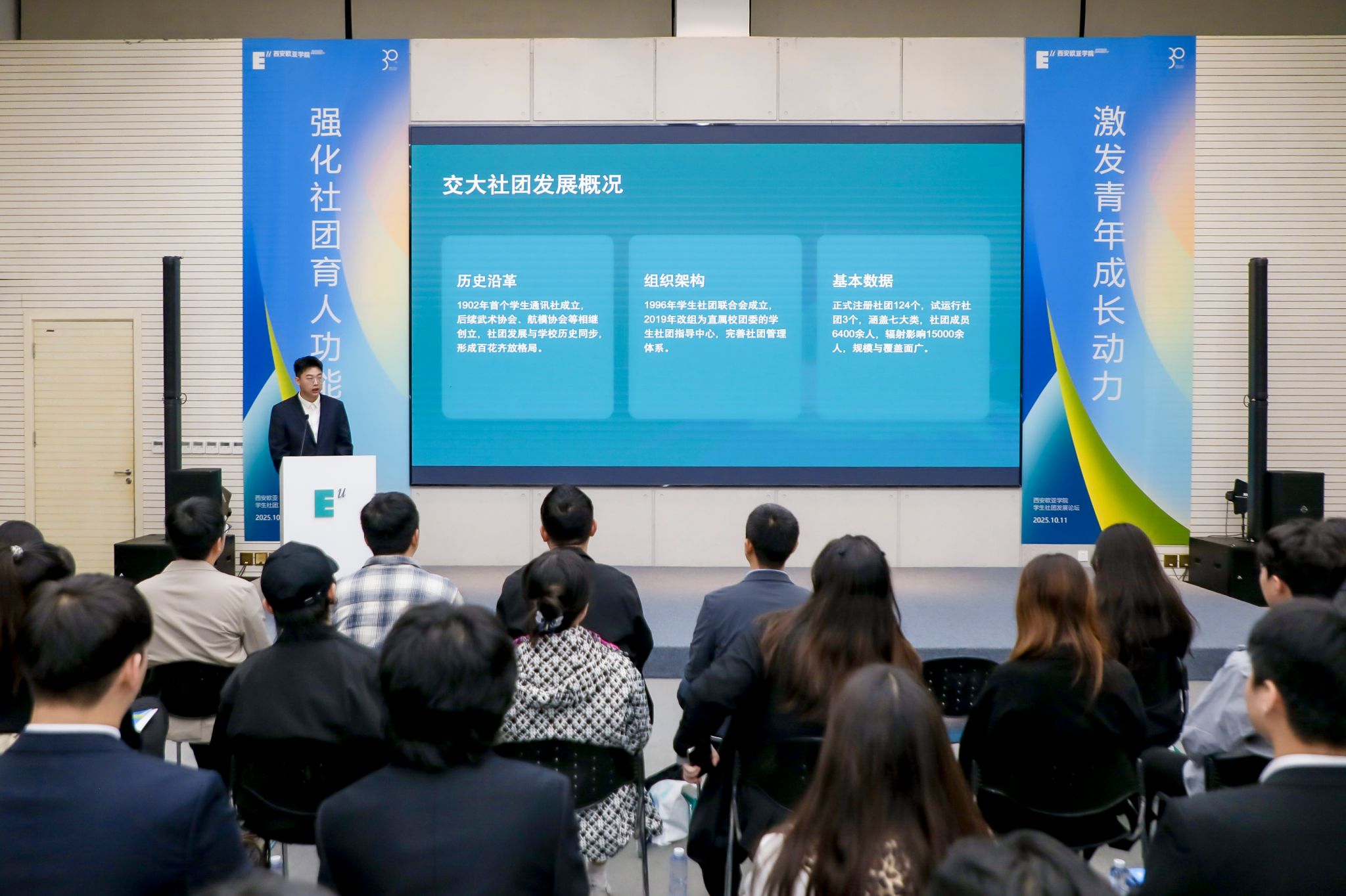 在高校经验交流环节中,来自西安交通大学的张家铭同学以交大社团运营管理体系为例,详细介绍了学校在社团资源配置、组织架构优化、社团干部培养及品牌项目孵化等方面的创新做法。