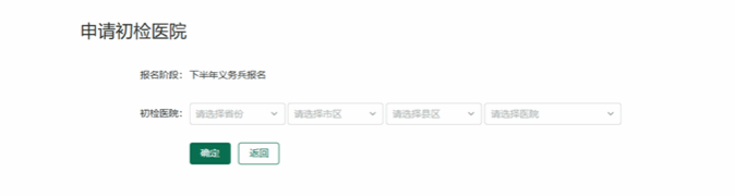 务兵报名信息填写完毕并成功提交后,请在当地乡镇武装部或高校征兵工作站工作人员的指导下,点击“我的进度”里的“初检初核”按钮,选择初检医院进行初检。