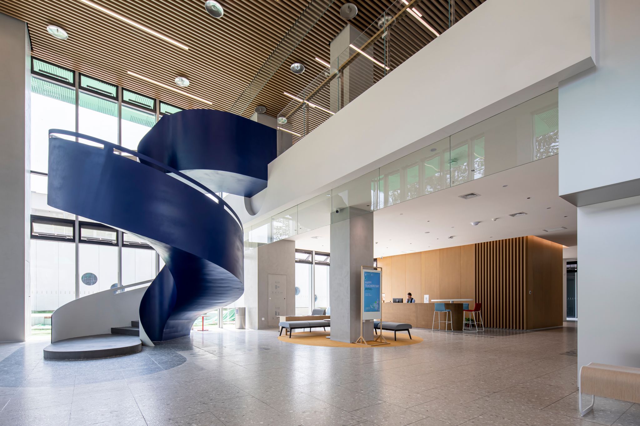 位于楼体中心的特殊装置“鸟巢”,是作为互通空间里的会议区域,全透明的玻璃架构外层同等距地包裹着木条,既不影响光线的穿透感,又保留了一丝视线的隐秘感。考虑到光的因素,行政中心楼层的颜色透明度各异,由下自上逐层加大。渐变色的回廊墙体,围绕并包裹着位于不同楼层、不同位置的3个鸟巢,好似太空中的球体,让置身其中的人仿若漂浮一般,慢慢遗忘外界而进入一个新的境界。