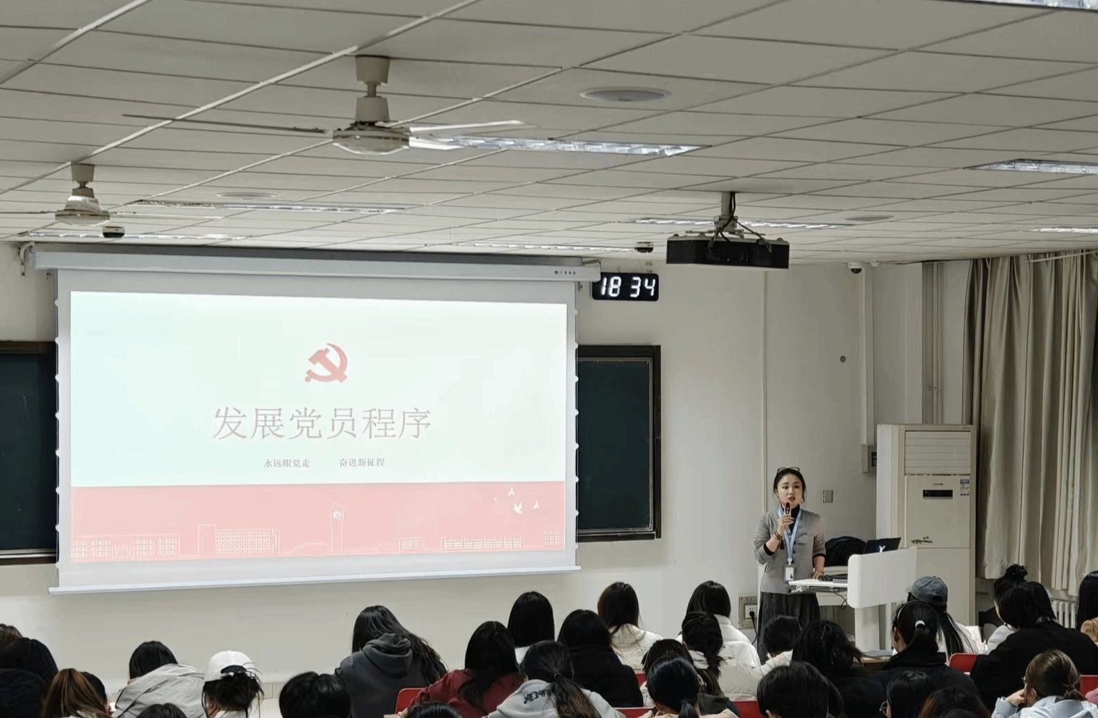 2025年11月12日,第四青年社区分党委组织94名入党积极分子开展专题党课学习,马克思主义学院霍雨佳老师围绕习近平新时代中国特色社会主义思想及党的二十届四中全会精神进行深入解读。